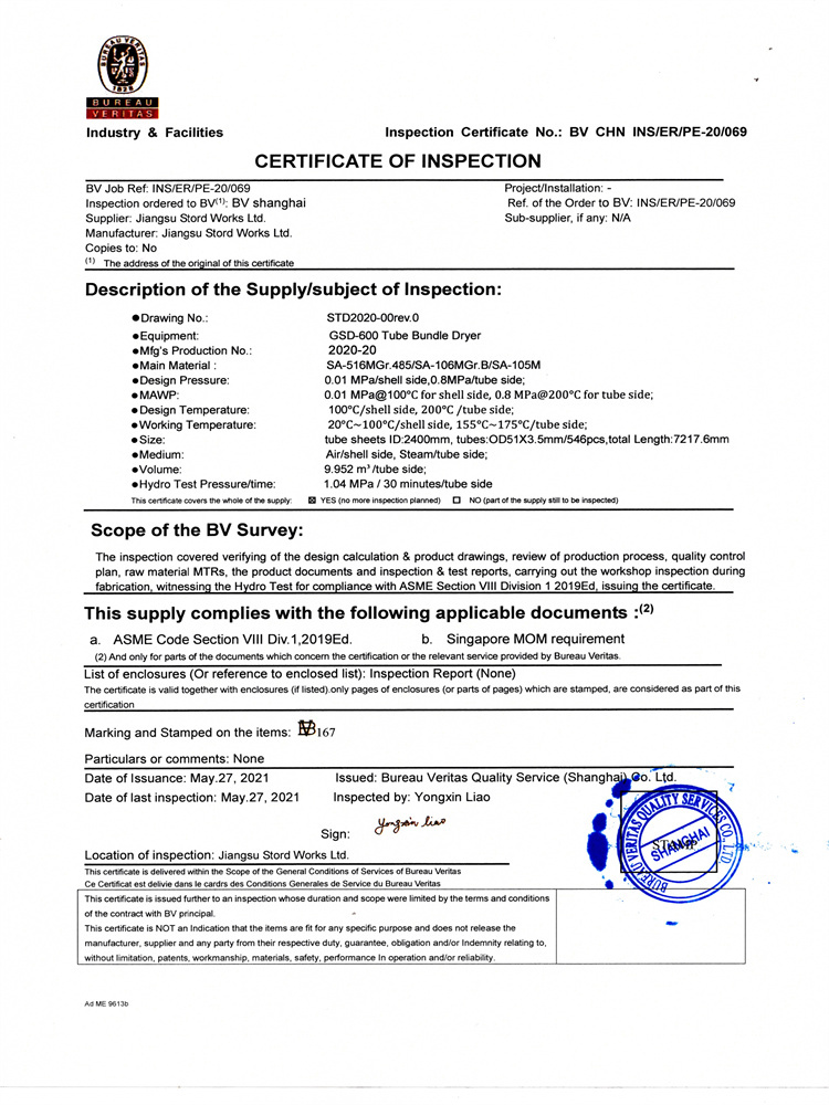 GSD-600 管束干燥機(jī) MOM認(rèn)證證書