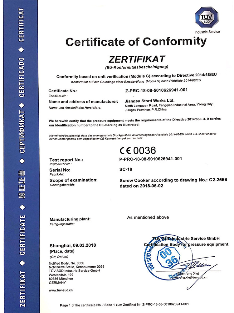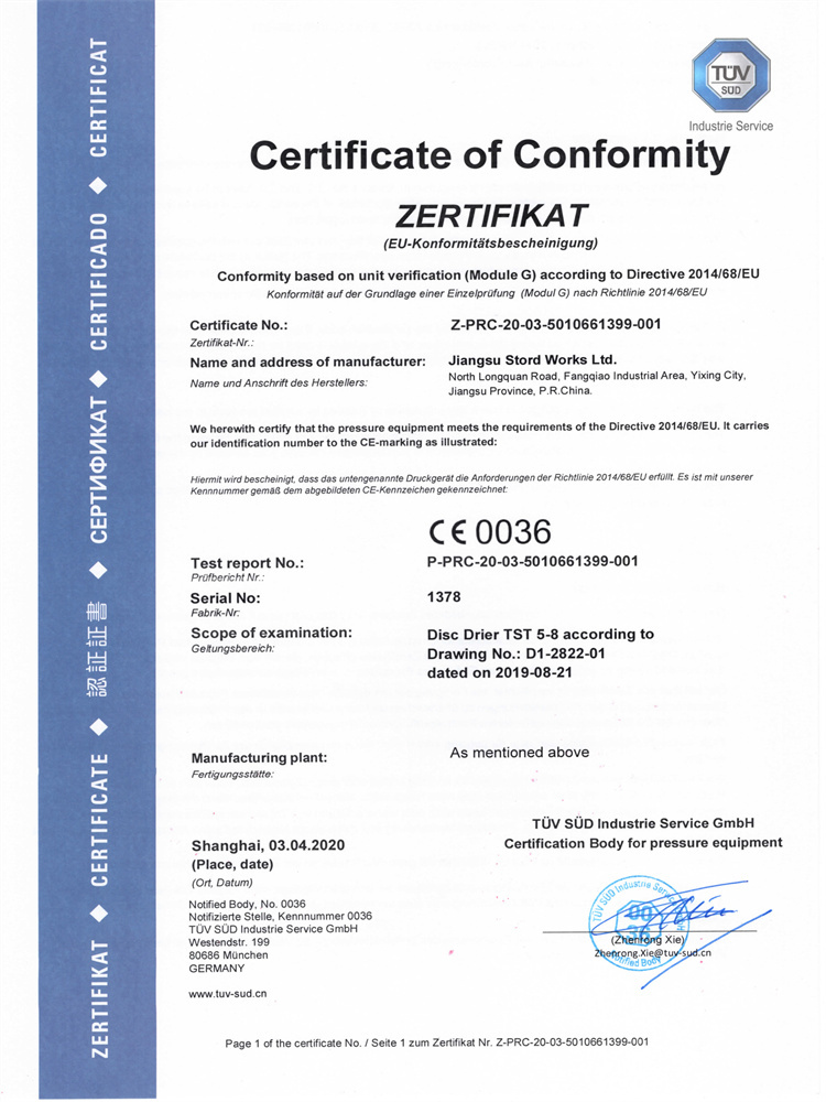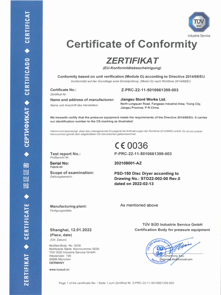 TST 5-8 圓盤干燥機(jī) PED Model G證書