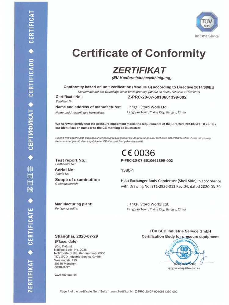 換熱器冷凝器 PED Model G 證書